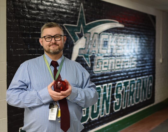 Shane Healy, a social studies teacher at Capital High School in Kanawha County, earned WVPB’s December 2025 Above and Beyond Award. As part of the recognition, Healy received a monetary award and a signature Blenko Glass apple paperweight. The West Virginia State Treasurer’s Office, presenter of the SMART529 college savings program, proudly sponsors the award.