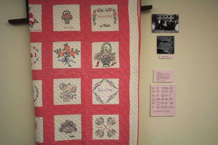 Rakowski said it’s one of her favorites, and with good reason: some 20 hand-embroidered squares, each containing a floral design, and more importantly the name of its maker, are bordered with pink and white fabric borders.