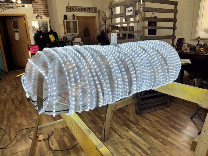The base of the roll is an aluminum tube. Courtesy: Ben KolbThousands of LED lights and battery packs are added to the sculpture, which increases the weight significantly. Courtesy: Ben KolbOrganizers raised the giant pepperoni roll with its heavy LED lights into the air in preparation for the 2024 celebration.Before the heavy LED lights and battery packs are added to the final product, Ben Kolb lifted the giant pepperoni roll overhead. Courtesy: Marion County CVB