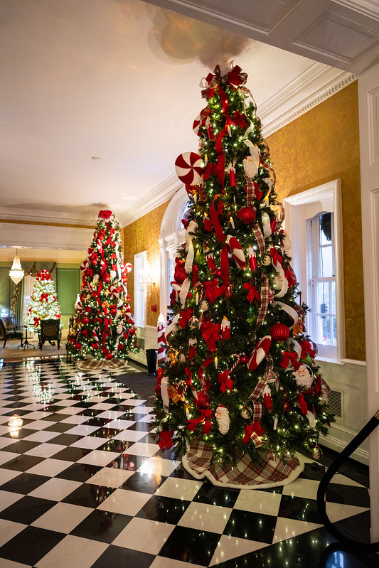 Inside the mansion are multiple Christmas trees, each decorated with a different theme.