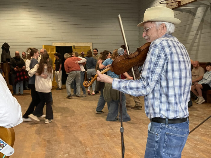 Gerald "Gerry" Milnes, plays a fiddle for dancers at the Fastnacht festival in Helvetia, West Virginia. Courtesy West Virginia Humanities Council