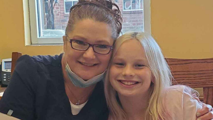 BPJ, the Harrison County student, with medium length blonde hair, and her mother, mask on her chin.