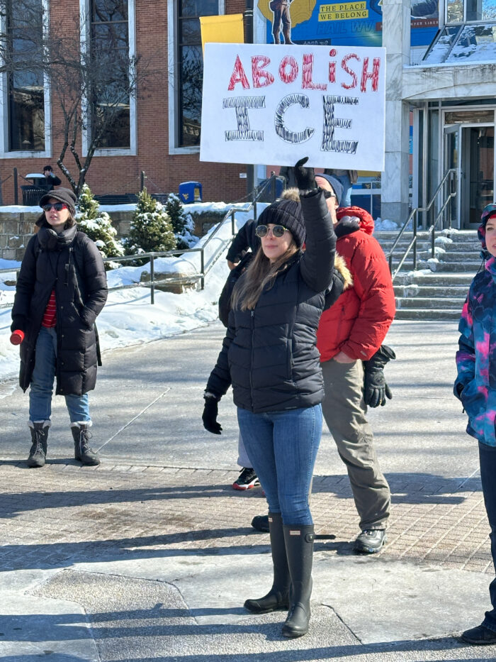 A demonstrator holds up a sign with “Abolish ICE” in front of the West Virginia University Mountainlair on Jan. 30, 2026.