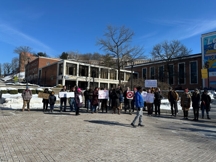 Demonstrators chant in front of the West Virginia University Mountainlair on Jan. 30, 2026.