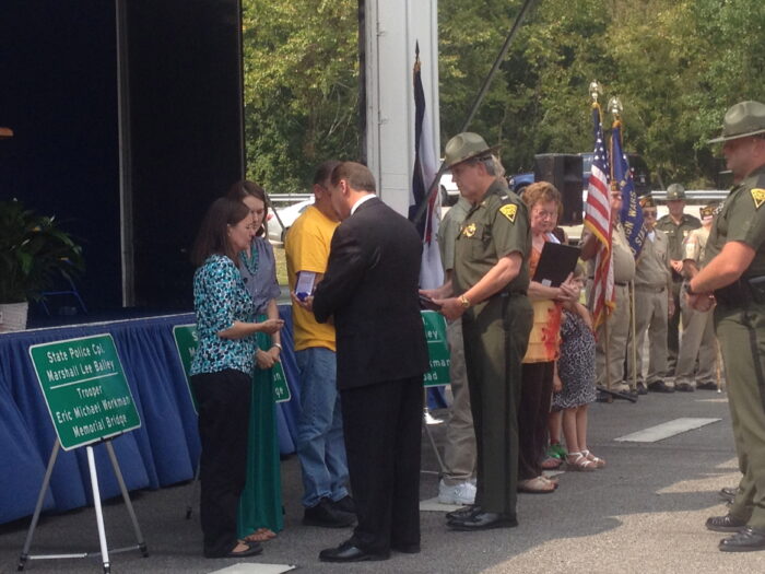 Families of both fallen troopers were presented with the State Police Cross by Col. Smithers and Gov. Tomblin to symbolize the officers’ sacrifice in the line of duty. Both families also were given signs marking the memorial bridge.