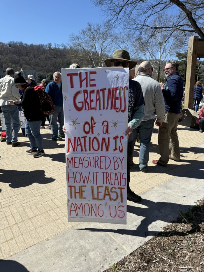 Frank Litton, who towered over most of the crowd, held a sign almost as tall as he was. It read, “The greatness of a nation is measured by how it treats the least among us.”