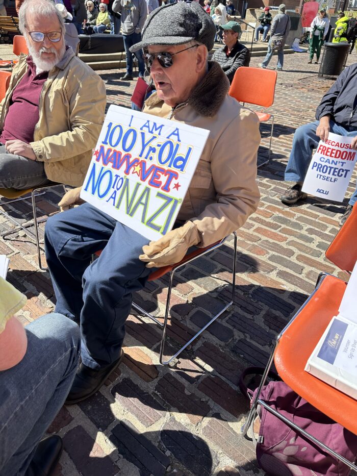 As a 100-year-old Navy veteran, Cebern Baker was perhaps the oldest protester in Huntington Saturday. Organizers of the No Kings event said they felt it was important to have a space that was inclusive and accessible for anyone who wanted to attend. Photo credit: Kim Baker